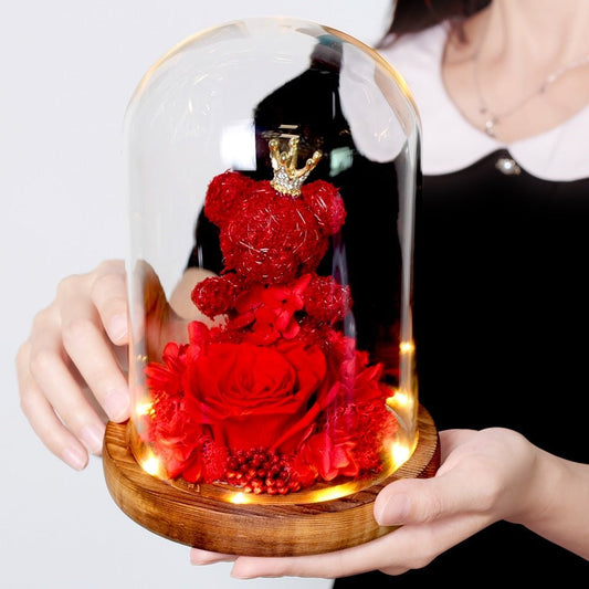 Eternal Rose Teddy Bear Under Bell & Red LED