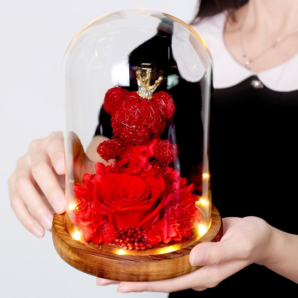 Discover this adorable little teddy bear and its eternal rose under a bell lit with a thousand lights. Anyone will succumb to its charm