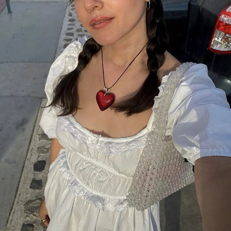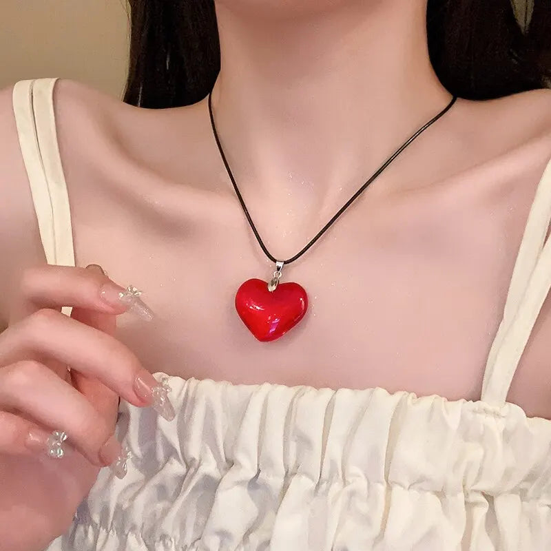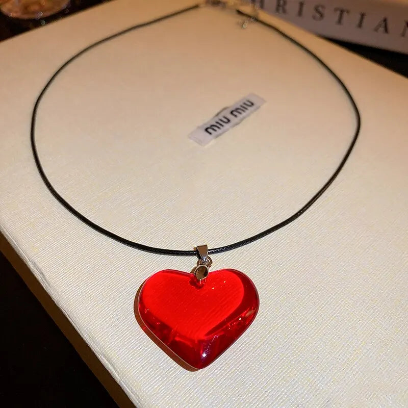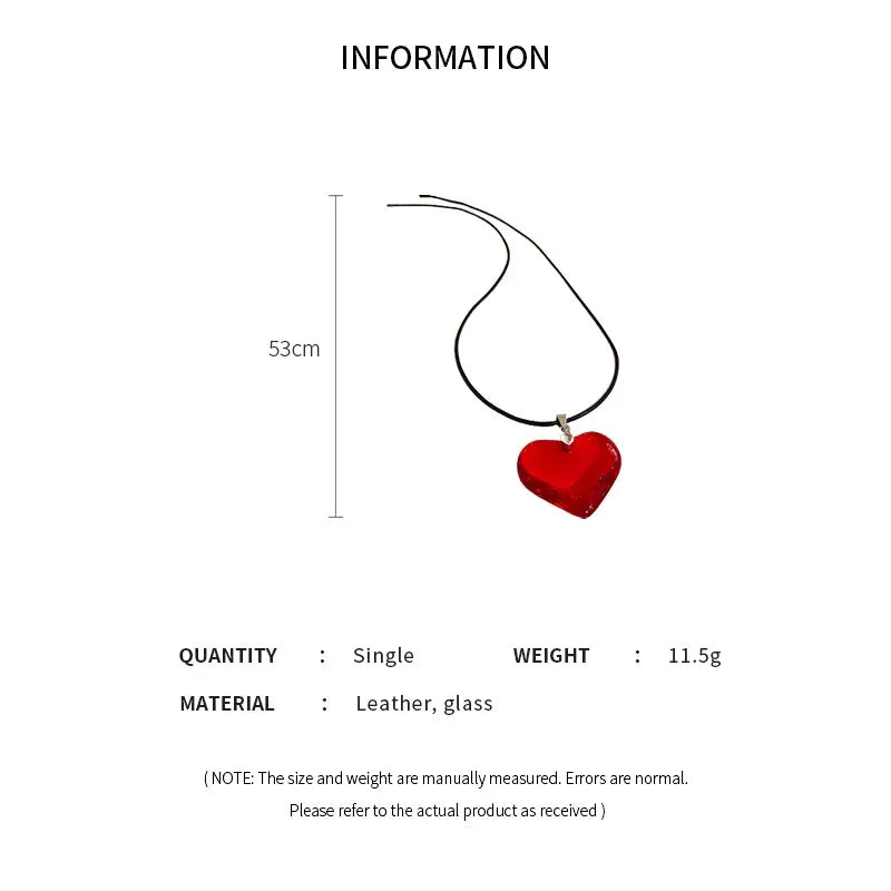 Red Heart Pendant Necklace - Glass Crystal on Black Leather Rope Chain